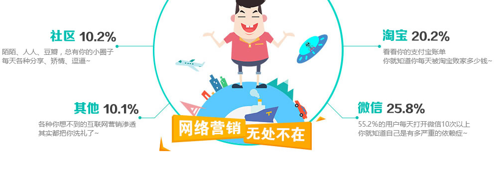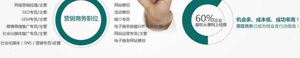 就业方向:网络营销总监、网络营销经理、SEO专员、SEM专员、微博微信推广专员、社会化媒体推广专员、网站策划、活动策划、电子商务数据分析专员、网站运营专员、媒介广告专员、网络营销顾问等。